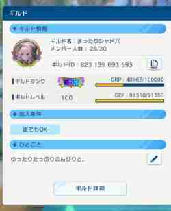 【ひとこと】:ボイチャ無し 基本スタンプのみ まったりゆっくり ギルメン募集中 ノルマ無し 前期S 報酬目当てOK あと10人!!