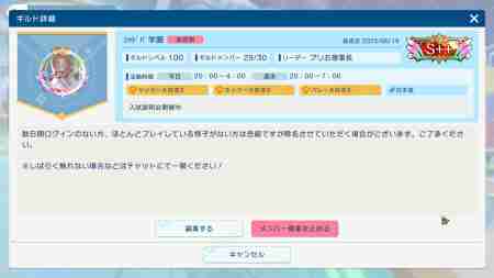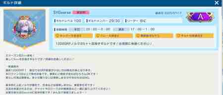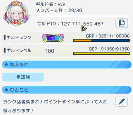 【ひとこと】:S++目指してます!現在マスター在籍数25名です!ギルドレベルは100で、現在ギルドランクはAです。AA3 以上の方を募集しています!特にノルマ等ありませんので気軽に申請お願いします!