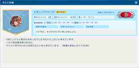 【ひとこと】:現在5名在籍中の新設ギルドです。特筆した条件等もございませんので、新しいご縁をお探しの方はお気軽にご加入頂ければ幸いです。メンバー一同心よりお待ちしております。