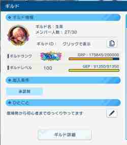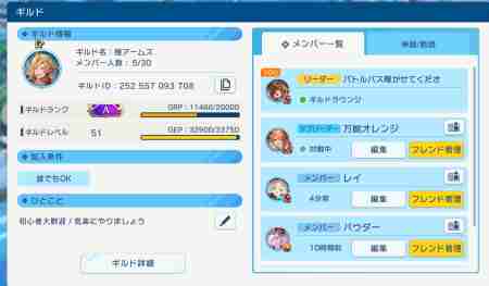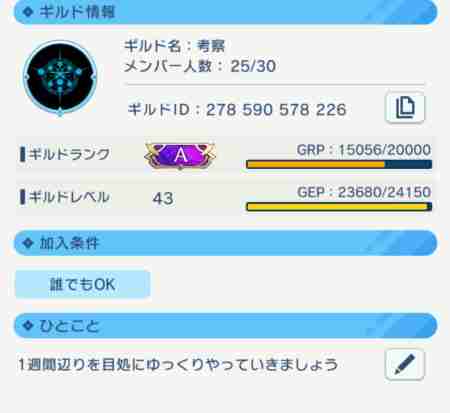 【ひとこと】:メンバー現在4人のエンジョイギルドです。ノルマ等はありませんが今のところギルド宝箱は最大レベルで受け取れている比較的アクティブなギルドです。もしよければお気軽に申請ください。